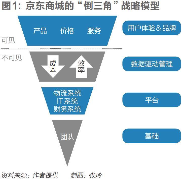 团队是基础层、根基层,上面一层是系统层,就是公司最核心的三个系统——IT系统、物流系统和财务系统,最上面就是用户(图1:京东商城的“倒三角”战略模型)。