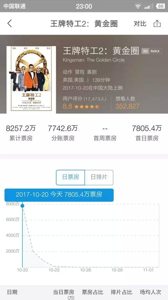截至今晚(10月20日)23:00,《王牌特工2:黄金圈》目前票房累积8257.2万,首映票房7805.4万,日排片以36.8%占据绝对优势,还有前作的口碑保证,相信这一部的市场表现依旧出彩。