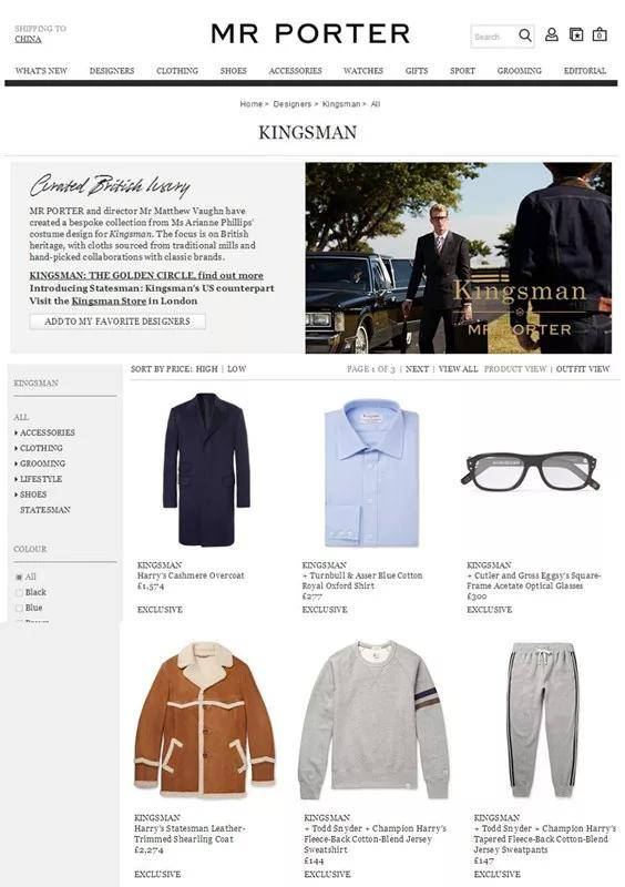 如今在Mr. Porter官网上输入“kingsman”可以搜索出《王牌特工:黄金圈》片中大部分同款服饰、物品。(只是为了说明问题,不是打广告)