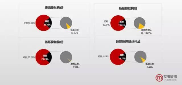 以杨幂唐嫣为例,唐嫣的粉丝构成当中有22.86%的黑粉,黑粉当中我们会发现有10.14%是来自于杨幂,这和两人一个出演剧版《何以笙箫默》,一个出演影版脱不开关系;而迪丽热巴和Angelababy双方粉丝则是由于《跑男》“杠上了”,Angelababy的粉丝当中有19.63%的黑粉,这19.63%的黑粉有18%左右是迪丽热巴的粉丝,这并不夸张。