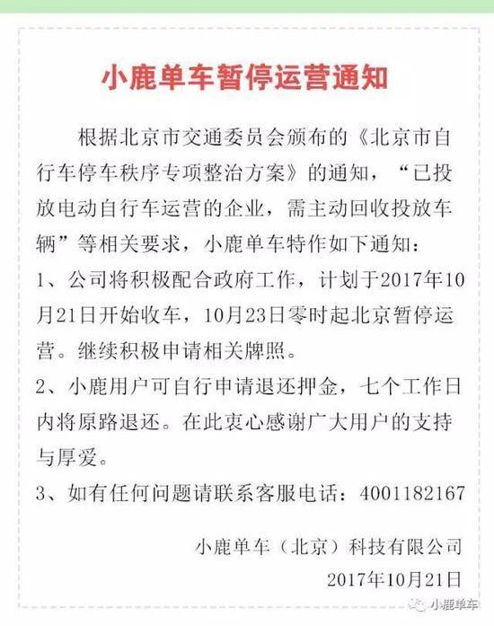 针对暂停的原因,通知中称,北京市交通委员会已经颁布《北京市自行车停车秩序专项整治方案》,要求已投放电动自行车运营的企业,需主动回收投放车辆,因此,小鹿单车积极配合暂停运营。用户可自行申请退还押金,7个工作日内将按原路返还。