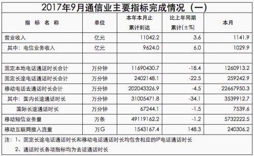 9月,电信业务总量完成2620亿元,同比增长89.4%。三家基础电信企业完成电信业务收入1030亿元,同比增长7.2%,增速较去年同期提高5.4个百分点。