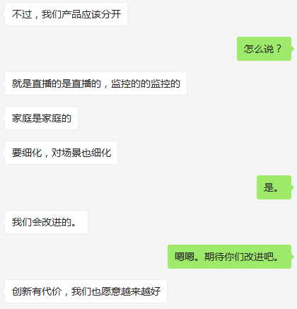 对方还跟我说,360会关掉360智能摄像头的直播功能,调整产品,“我们产品应该分开,就是直播的是直播的,监控的是监控的,家庭的是家庭的,(产品)要细化,对场景也细化。”