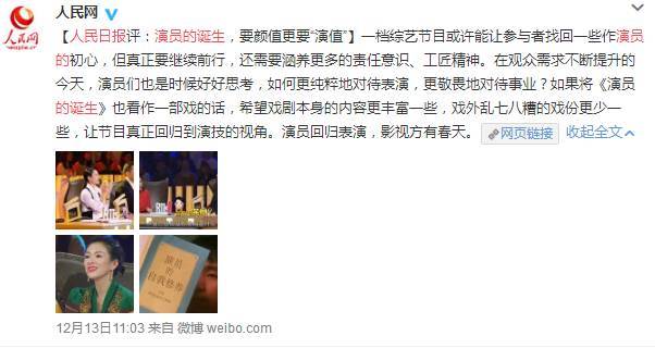 《人民日报》也发出评论称:“如果将《演员的诞生》也看作一部戏的话,希望戏剧本身的内容更丰富一些,戏外乱七八糟的戏份更少一些,让节目真正回归到演技的视角。”