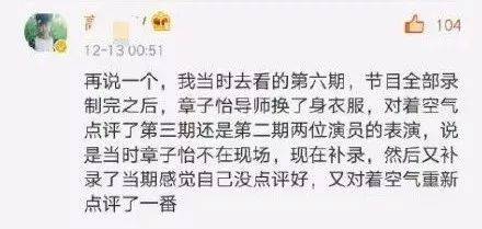 更重要的是,时间轴混乱还给节目造假提供便利。有网友爆料:“由于章子怡第二期时不在场,在未观看选手表演的情况下,后来在第六期时补录了点评。”
