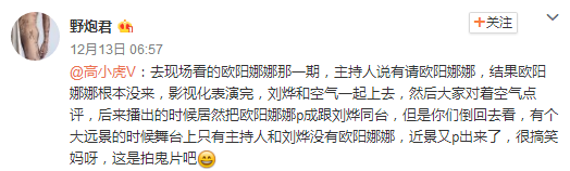 该网友表示:“欧阳娜娜当时并不在场,刘烨与空气同台,但在播出时,近景镜头中,刘烨旁边却站着欧阳娜娜,而在远景镜头中则只有刘烨一人。”