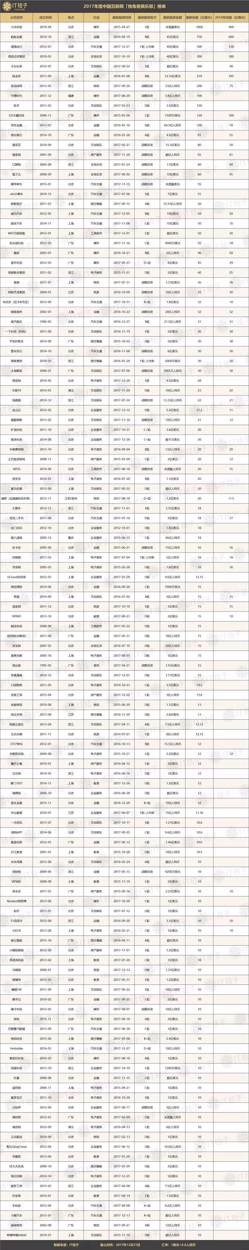 一、2017年度中国互联网“独角兽俱乐部”榜单