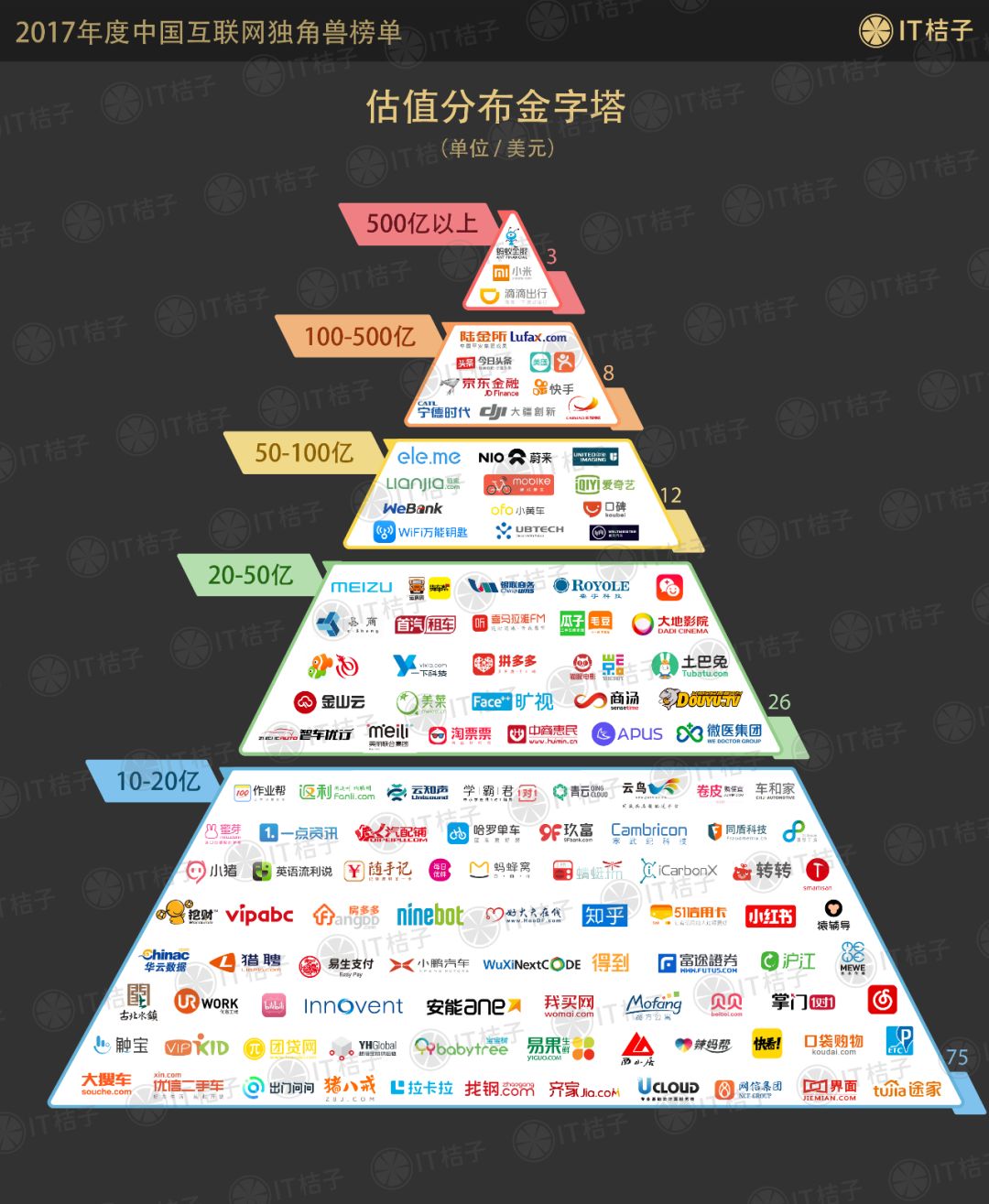 从《IT 桔子 2017 年度中国互联网“独角兽俱乐部”榜单》估值区间来看,我们将其细分为 5 个阶段,做出了如上的估值分布金字塔。