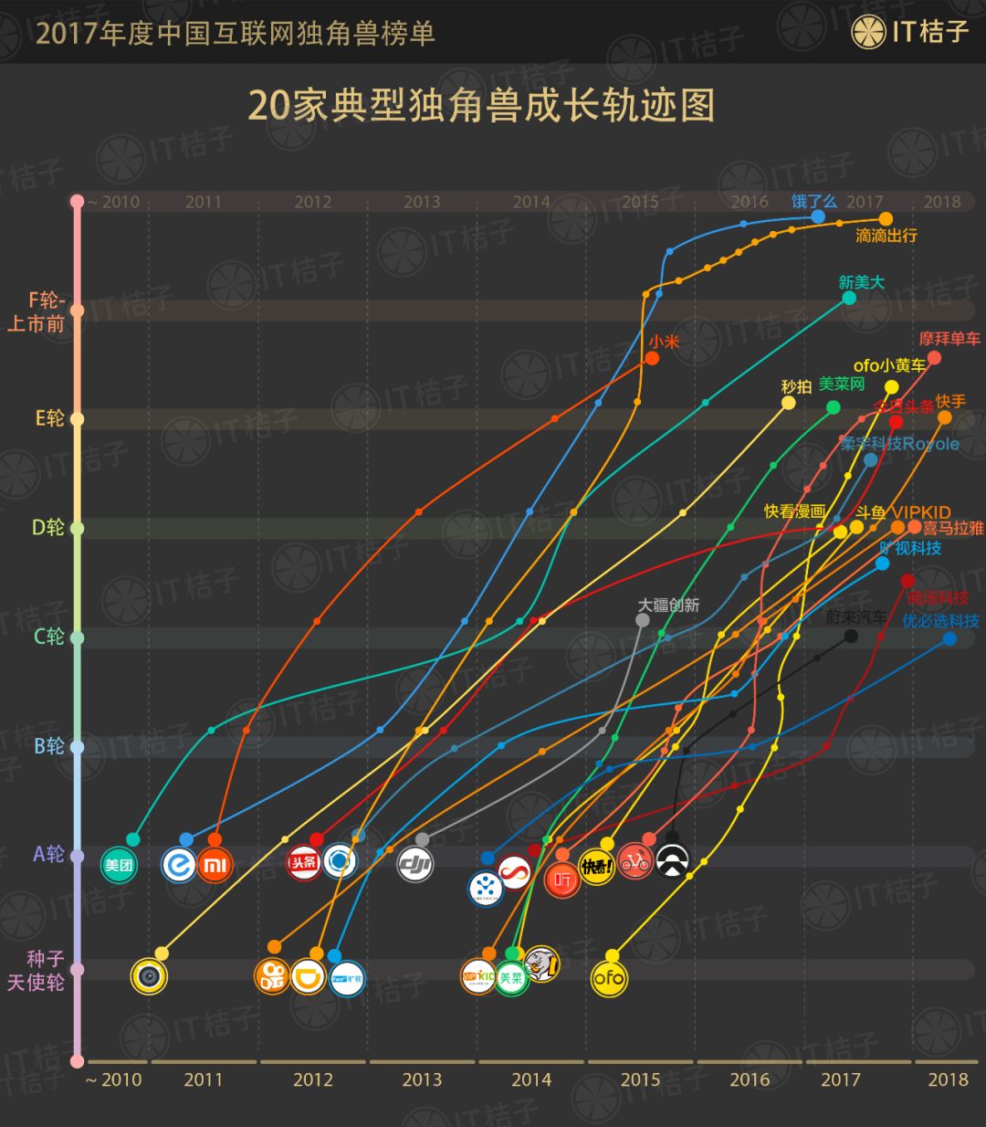 IT 桔子(ID:itjuzi521)基于独角兽的估值区间,选取了 20 家非常典型的独角兽公司,将他们的融资时间作为横坐标、融资轮次及节奏作为纵坐标,每家公司的每一轮融资是“点”,然后“连点成线”,形成了如下 20 条曲线(折线),不知道你更喜欢哪类公司的成长轨迹?