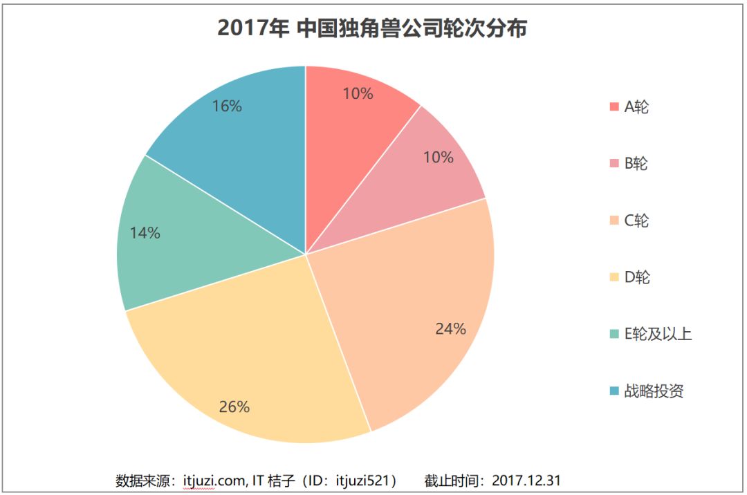 最新融资轮次:从独角兽公司的融资轮次来看,占比最高的是 D 轮(32 家公司、占比 26%),其次是 C 轮(30 家公司,占比 24%),相比 2016 年度占比最高的 B 轮,最重要的原因是不少 B 轮的公司均在 2017 年继续获得资本加注,有些公司甚至一年完成好几轮融资,在资本助推下高歌猛进到成熟期阶段(D 轮及以后)。