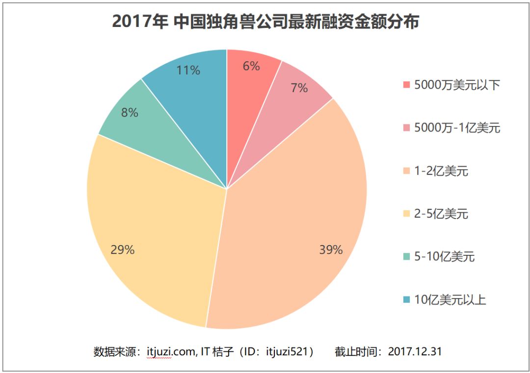 最新一轮融资停留在 2016 年的公司有 28 家、占比 22.6%,接近四分之一的公司在 2017 年并没有拿到钱,靠着 2016 年的融资金额勉强维持在独角兽榜单中,再往后面、他们被淘汰的可能性是非常大的。