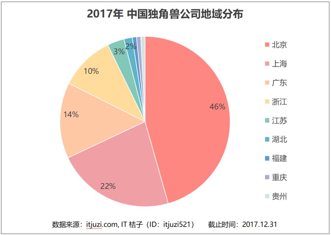 其中北京仍以 57 家公司、占比 46% 高居首位,相比 2016 年的 42% 比例有小幅上升;上海以 28 家公司、22% 占比位居第二位,相比 2016 年的 23% 略有下滑;广东以 18 家公司、占比 14% 位居第三位,相比 2016 年的 17% 有一定下降,主要是被北京获得;浙江以 13 家公司、10% 占比位居第四位,相比 2016 年的 11% 略有下降。可见,北京仍然是独角兽出没最多的地方,尤其是在文化娱乐领域捕获独角兽最多;而上海、浙江这两个区域在电子商务、金融领域捕获独角兽较多;广东的硬件和金融领域则产生独角兽更多。