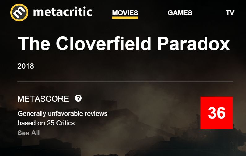 在集聚权威媒体意见的Metacritic上,《科洛弗悖论》的评分仅为36分。而截至9日,该片在烂番茄上的新鲜度仅为20%。