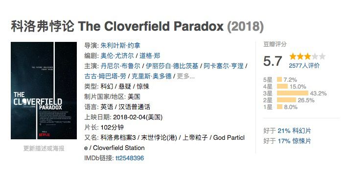 不仅如此,《好莱坞报道》2月7日披露,Netflix花了超过5000万美元从派拉蒙手中买下了这部电影的线上独播权。然而上线5天以来,《科洛弗悖论》遭遇了普遍差评——截至目前烂番茄新鲜度仅20%,Metacritic评分也仅36分,豆瓣评分则为5.7分。
