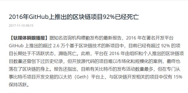 据知名咨询机构德勤发布的最新报告,2016年在著名开发平台GitHub上推出的超过2.6万个基于区块链技术的新项目中,目前已经有超过 92% 的项目长期处于不活跃状态,濒临死亡。