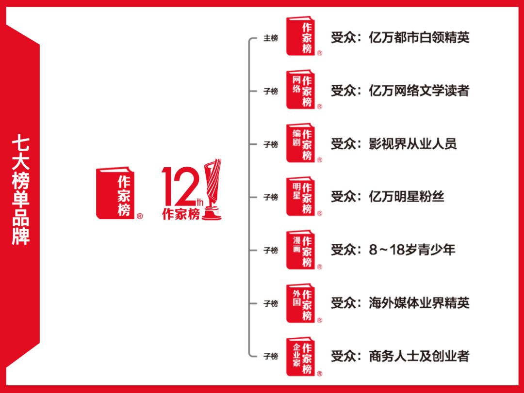 在官方介绍中,每个榜单品牌都有着对应的辐射人群:作家榜主榜以亿万都市白领精英为受众;网络作家榜的使命是辐射亿万网络文学读者;编剧作家榜寄托了主办方向影视界从业人员渗透的野心,明星作家榜则盯上了目前大热的粉丝经济;漫画作家榜的受众是8岁~18岁的青少年;外国作家榜对应海外媒体业界精英;企业家作家榜则力图涵盖商务人士及创业者。