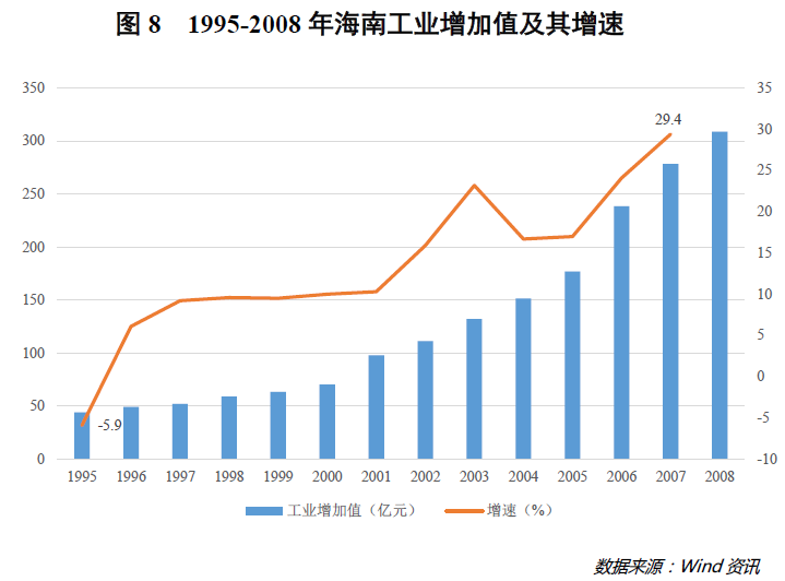海南省工业得到了长足发展,增加值由1995年的44.04亿元攀升至2008年的308.89亿元,同比增速也由1995年的-5.9%提高至2007年的29.4%(详见图8)。此外,工业占全省经济总量的比重从1995年的12.1%上升至2008年的20.6%。