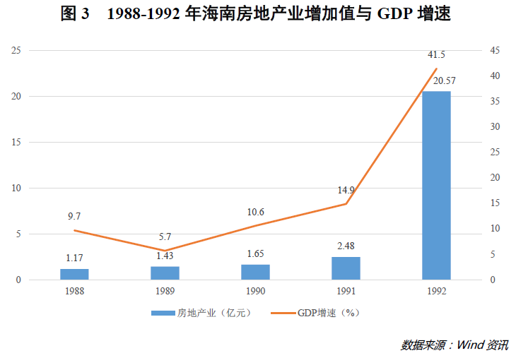 从宏观数据上来看,1992年的房地产业增加值为20.57亿元,比1991年的2.48亿元足足翻了8倍有余,可谓真正意义上的“激增”;受此影响,海南1992年的经济总量同比大幅度增长了41.5%(详见图3)。从某种意义上讲,房地产已然成为当时海南经济增长的核心动力之一。