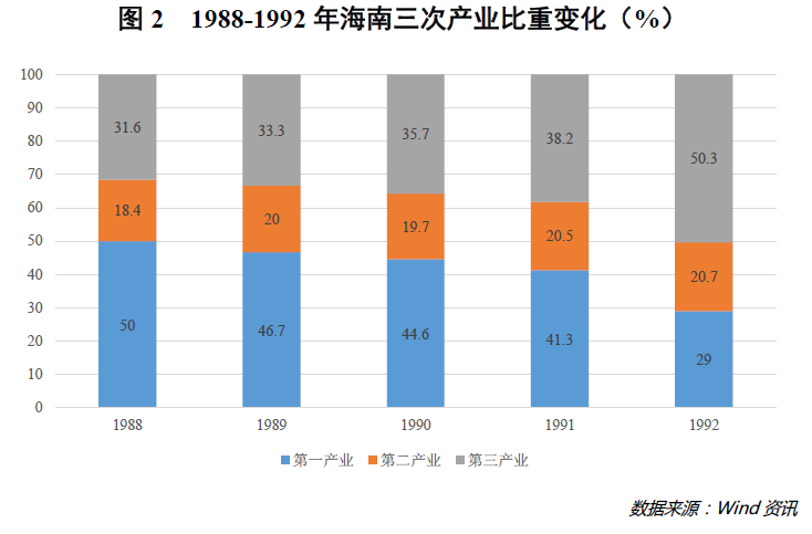建省,只是第一步;如何进行产业布局,才是接下来发展的关键所在。数据显示,1988年的海南,三次产业结构比例关系为50:18.4:31.6,农业主导态势凸显,服务业次之,而工业却极其薄弱。