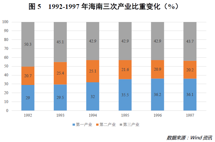 同时,第二产业占GDP的比重也随之下滑,1997年降至20.2%(详见图5)。如此看来,工业主导的发展愿景已经被彻底打断;又或者说,工业大概真的不适合作为引领海南经济发展的支柱。