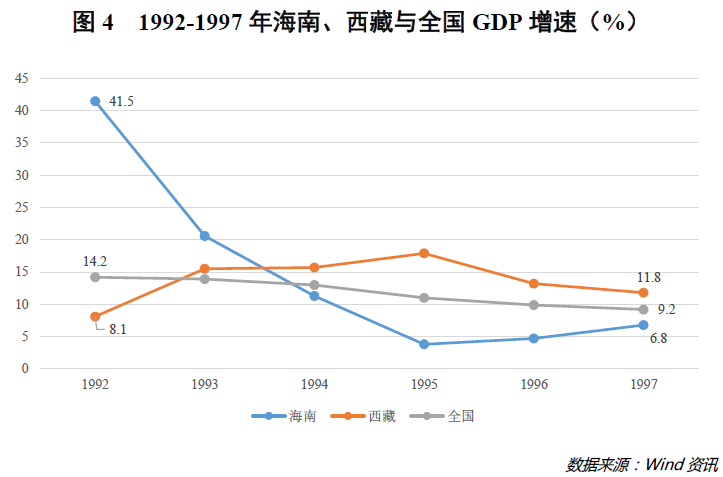 房地产泡沫的破灭重创了海南经济。从GDP增速来看,在经历了1992年的峰值(41.5%)后,海南经济开始呈现急剧下滑态势,1994年的增速已然被西藏超越,1995~1997年更是连续三年全国倒数第一(详见图4)。