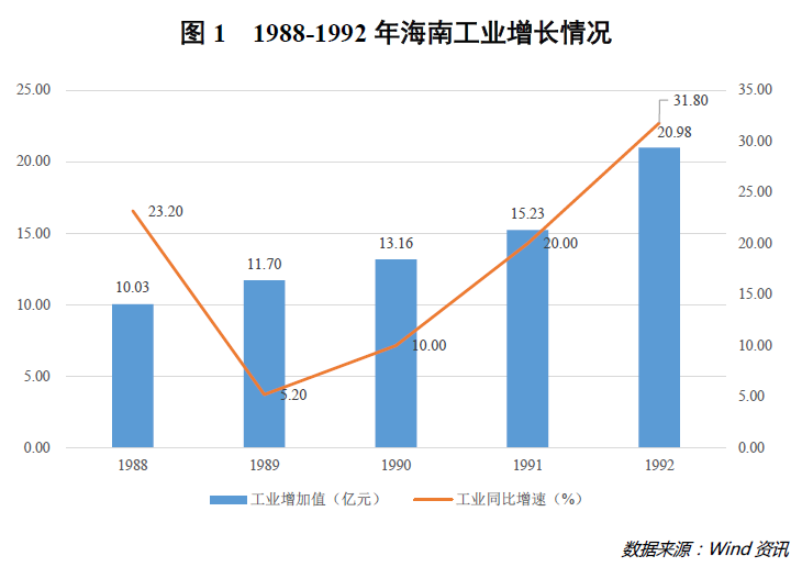以此为基调,海南将改善企业经营机制作为切入点,大刀阔斧发展工业。其间,广泛推行企业承包责任制和厂长负责制,而工业增加值也由此得以稳步提升,从1988年的10.03亿元增至1992年的20.98亿元,年均增速高达20.26%(详见图1)。