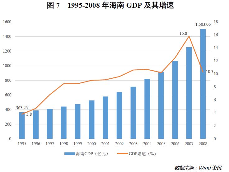 海南省经济总量由1995年的363.25亿元上升至2008年的1503.06亿元,年均增速为11.54%,且同比增速也由1995年的3.8%提高至2007年的15.8%,尽管受2008年全球金融危机影响有所下滑,但增速依旧高达10.3%(详见图7)。