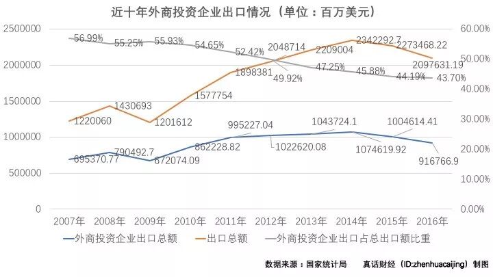 另外,如果从外商投资企业出口的总额看,从2007年到2014年一直都是上涨状态,但2015年和2016年出现了下滑。