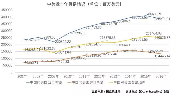 从上图中还可以看出,美国此次对中国发动贸易战,最主要的目的是希望中国能缩减贸易顺差,2007年,中国对美顺差是1632.85亿美元,2016年涨到2508.25亿美元。