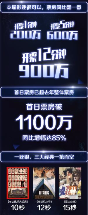 北影节官方独家售票平台淘票票提供的数据显示,4月1号开票当天,仅仅过了5分钟就已经成功出票9万张,累计票房突破600万,较2017年同时间内的300万增加了整整一倍,创历史新高。截至当天24时,首日票房更是达到了1100万,同比增长85%,亦是历史最高值。而包括诺兰的《黑暗骑士:蝙蝠侠》三部曲、《布达佩斯大饭店》《泰坦尼克号》在内的热门套票和单片,售罄速度也均刷新了历史纪录。