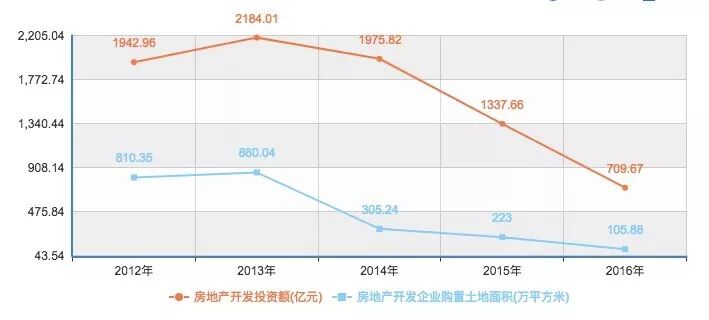 从图中可以看出,沈阳房地产开发投资在2013年达到顶峰后,之后的三年就出现了断崖式下跌,2016年投资额仅有2013年的32.46%;开发商购置土地面积只有2013年的18.9%。