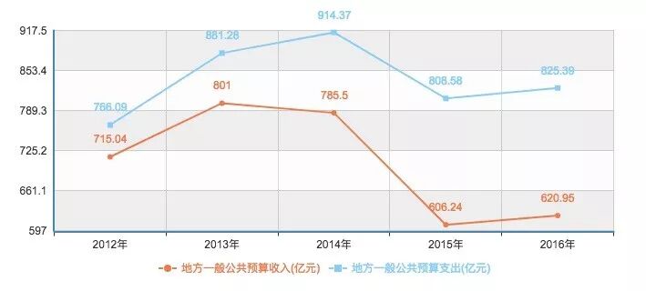 以上是近5年沈阳财政收支情况,基本上没有盈余,收入从2013年开始就逐年减少,2016略有反弹,但比2013年的高点依然少近180亿。