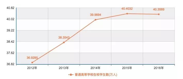 上图是近5年沈阳普通高校在校学生数,从2012年~2014年,每年有1万多人的增长,之后三年增速开始放缓,2016年出现了下滑,不过也就少了446人。