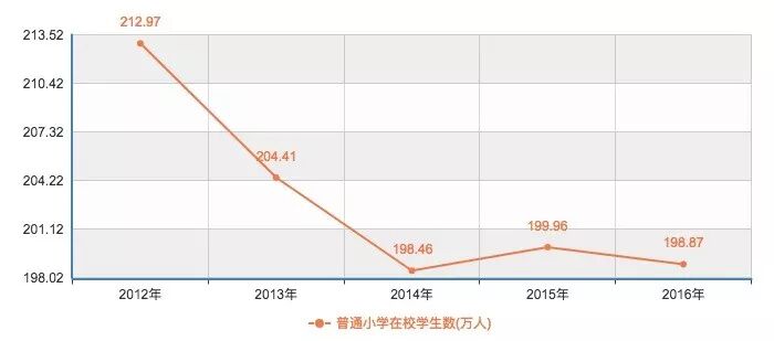 上图是近5年辽宁普通小学生在校人数,2012以来连续下降,2015年出现了小幅反弹后,2016年又出现了下降。