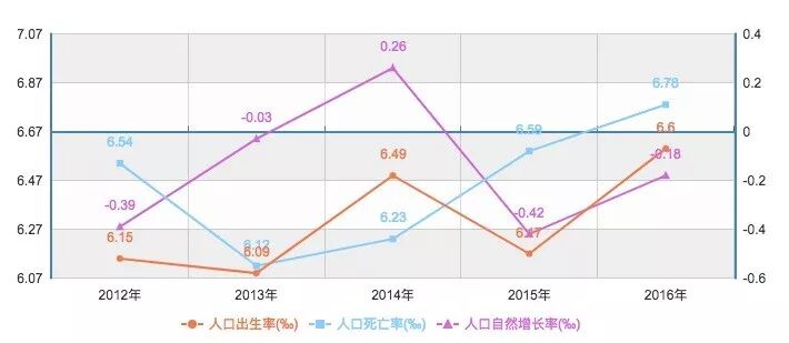 从图中可以看出,辽宁只有2014年的人口出生率是高于人口死亡率的,其余的4年时间都是死亡率高于出生率,直接导致的结果就是人口自然增长率4年为负。
