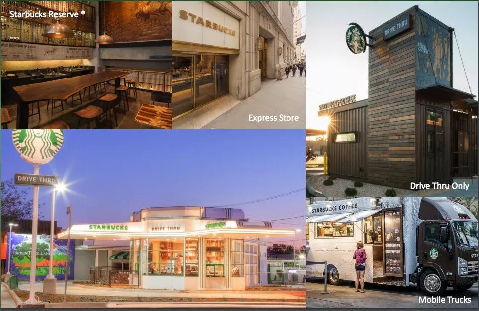 同时星巴克也在尝试诸如得来速、便利店、流动咖啡车等新型门店。