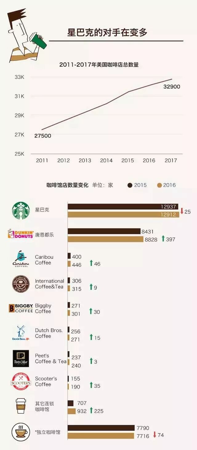 一方面,来自唐恩都乐(Dunkin’ Donuts )、麦当劳( McDonald’s)这样的快餐品牌以低价咖啡抢走了很多顾客;另一面,精品咖啡浪潮(第三次咖啡浪潮)中涌现的 Intelligentsia、Blue Bottle,咖啡师们用精湛的技艺吸引了高端顾客,加快了门店扩张速度。