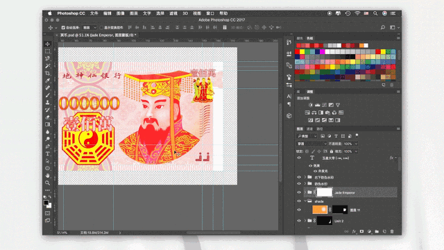 最后,添加冥币风味的装饰图案,调整图层样式、图层不透明度来模拟防伪效果,一张当代冥币就设计完成了。