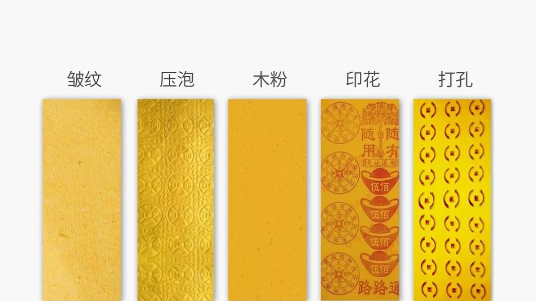 根据需求,烧纸可以添加皱纹、压泡、木粉、印花、打孔等多种效果,而每一种效果,都对应着不同的设备。