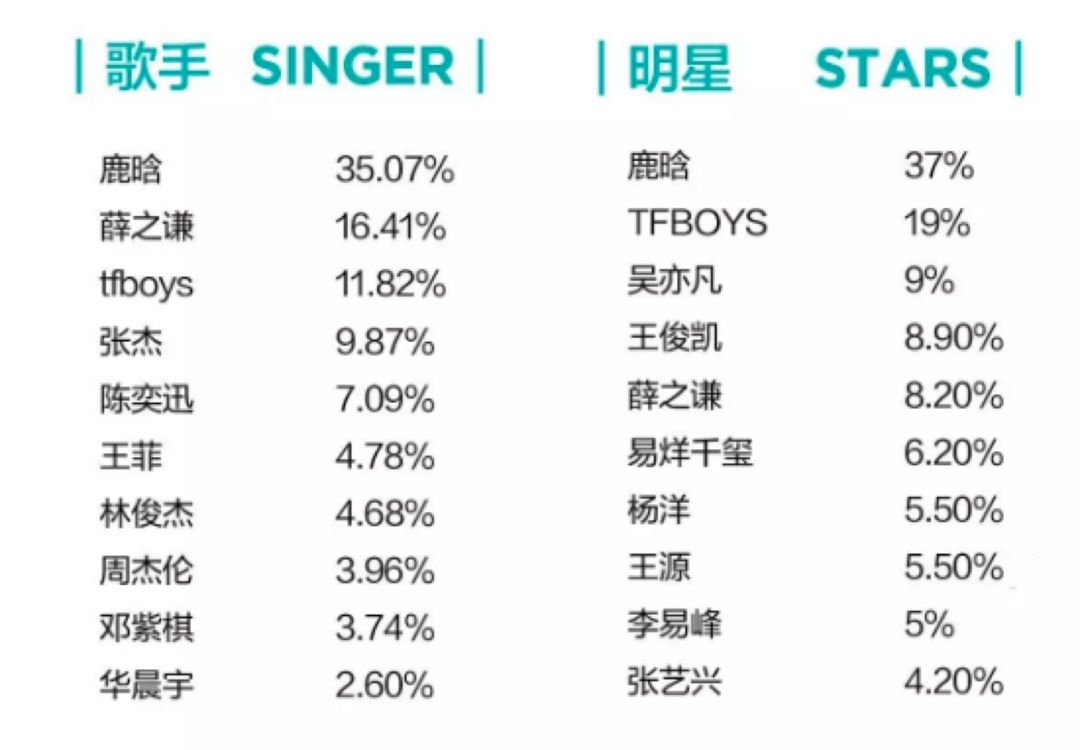 95后喜欢的明星排行 数据来源:腾讯QQ×城市画报《95后兴趣报告》