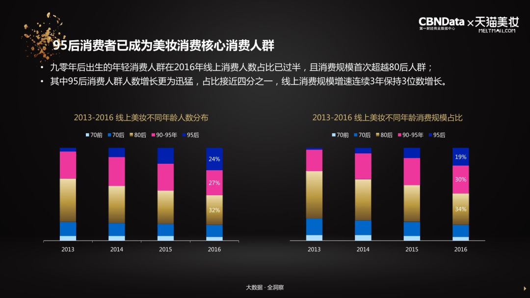 随着年轻人不断成长壮大,根据CBNData数据显示,美妆行业已不再过度依赖23岁~28岁年龄段人群,消费年轻化趋势不可挡。其中,95后消费者已逐渐成为美妆消费的核心人群,约占2016年线上美妆消费人群总数近四分之一,其线上消费规模增速连续3年保持3位数增长。