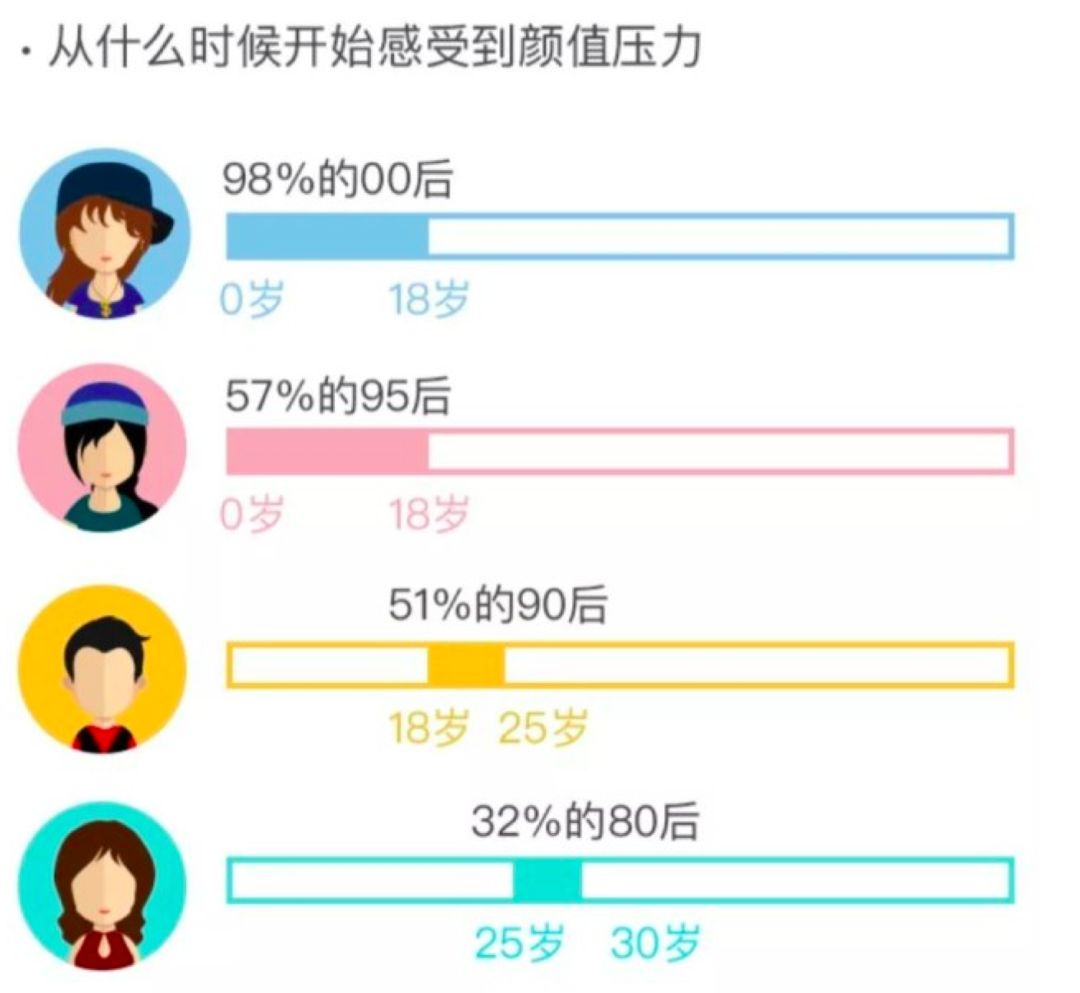 颜值压力无处不在,高颜值正成为新时代人们美好生活的“标配”追求,《中国青年颜值竞争力报告》数据显示,在社交、婚恋、职场等领域,八成中国青年认为提高颜值可以得到更好发展,九成青年认为高颜值对加薪有帮助。颜值效应达到新高度,各年龄段人群均在近10年感受到颜值压力,其中98%的00后从出生就感到颜值压力。