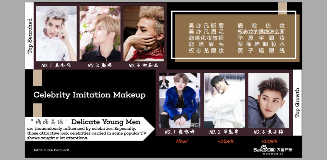 信息来源:百度《2017年男士化妆品行业报告》:吴亦凡、鹿晗和权志龙等诸多“带妆”男星,成了男士美妆打板面部妆容的首选。