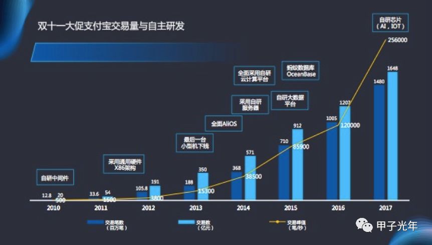 2009年,第一届双十一的销售额是5000万元;第二年,则爆炸式地增长到9.36亿元,翻了近20倍;第三年又进一步飙涨到52亿元……与此同时,支付宝系统需要承载的TPS(每秒交易数)也一路达到前无古人的地步,2017年的最新数据是25.6万笔/秒——世界上任何别的公司都没有经历过如此高的TPS场景。
