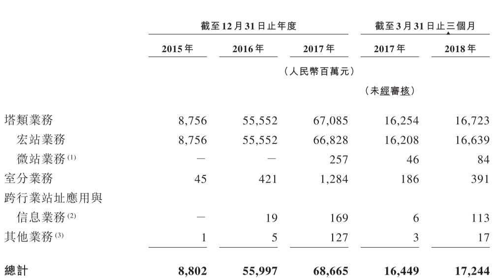 中国铁塔的业务主要包括三类,一是塔类业务,细分为宏站业务与微站业务;二是室分业务;三是跨行业站址应用与信息业务。