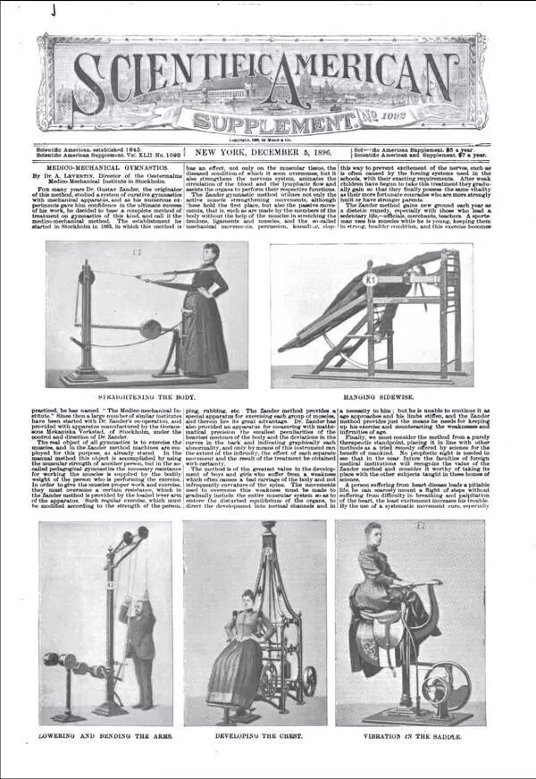 这批颇具蒸汽朋克风格的机械设备正是由瑞典医生古斯塔夫·詹德(Gustav Zander,1835-1920)研制的健身器械,在1876年的博览会上,詹德的设计荣膺最佳机械设计奖,这些稀奇古怪的装置从此冲出欧洲,走向美国。