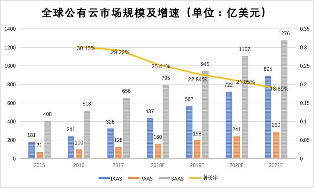 据Gartner发布的最新数据显示,2017年,以IaaS、PaaS和SaaS为代表的全球公有云市场规模达到1110亿美元,增速29.22%。预计未来几年市场平均增长率在22%左右,国际云计算市场依旧是一片蕴含着广阔前景的蓝海。