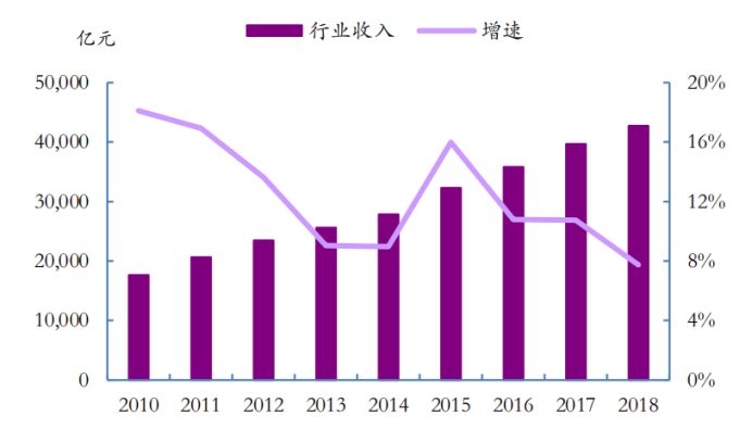 餐饮业是国民经济中增长速度最快的行业之一,过去的30年全行业的年均增速18.6%,增速远远超过GDP和人均国民收入的增长。从规模上看,全国餐厅总数已经超过600万家,中餐占到75%。2018年餐饮市场收入也已经突破4万亿元,占2018年38万亿的社会零售总额的10.5%。