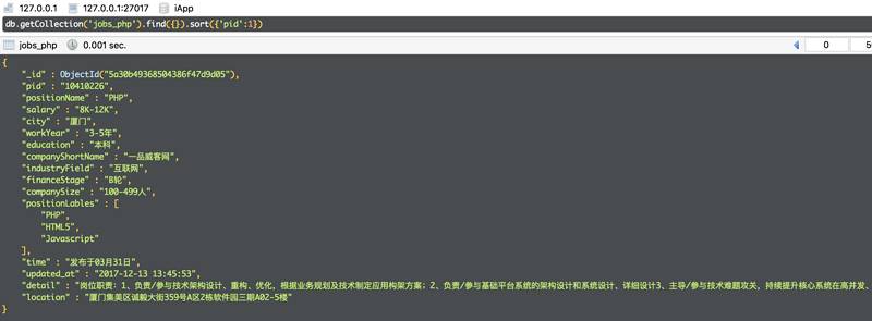 在文章《Python爬虫框架Scrapy实战 - 抓取BOSS直聘招聘信息》 (链接:http://www.jtahstu.com/blog/scrapy_zhipin_spider.html)中,只是爬了 上海-PHP 近300条数据,后续改了代码,把12个城市的 PHP 相关岗位的数据都抓下来了,有3500+条数据,慢慢爬吧,急不来。