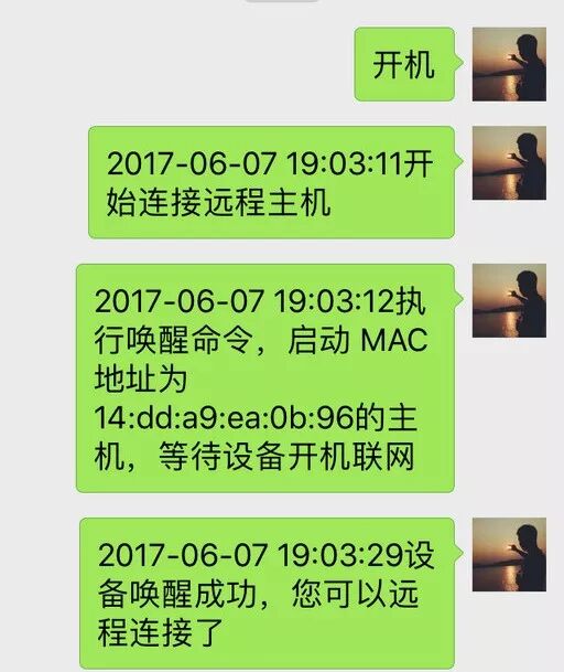 首先通过微信发送开机指令,这里我使用的是 itchat 程序会调用 Paramiko 库去 SSH 远程到内网的树莓派执行 WakeOnLan 命令去唤醒 Windows 主机。